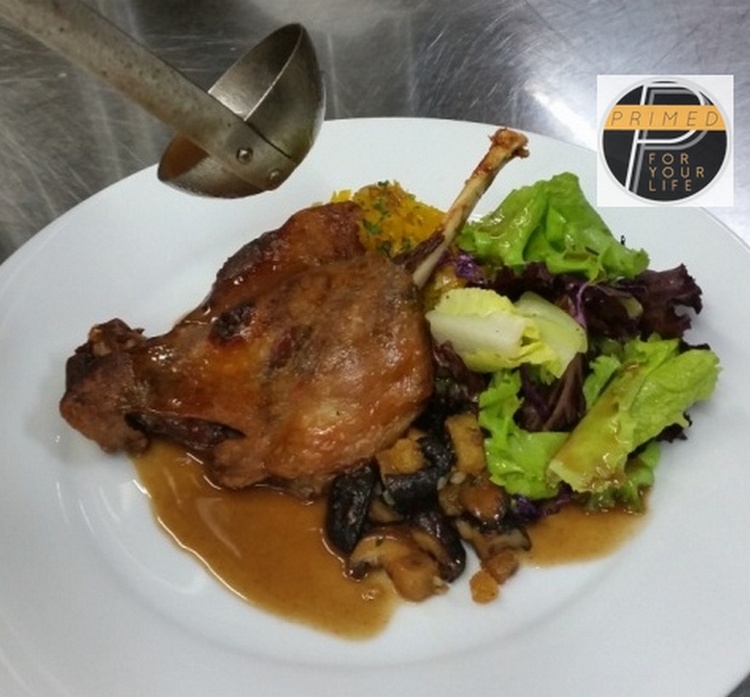 Duck Leg Confit, Squash rice, Mushrooms a la Bordelaise