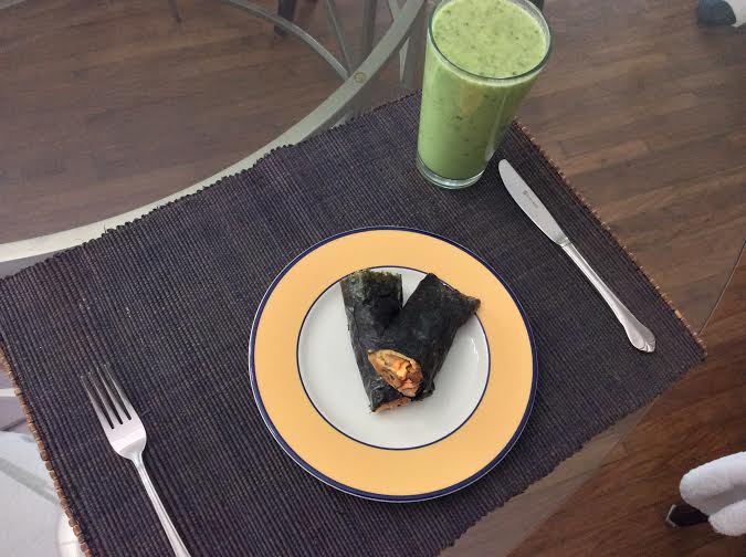 6. You are then ready to serve with a nice Green Smoothie of water, coconut milk, coconut oil, malunggay, bananas and either more greens like pechay or berries for sweetness.