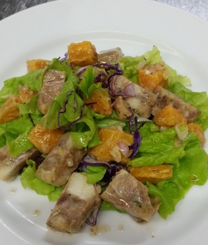 4. Put toss Pork head pate and sweet potatoes with mustard Vinaigrette and chopped shallots on top of the salad.