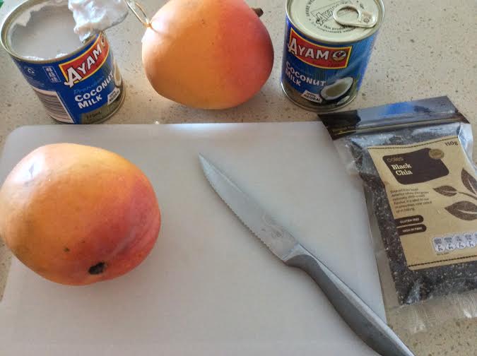 1. Simply cut your mangoes into small chunks, add coconut milk and then chia seeds. Stir in then place into fridge.