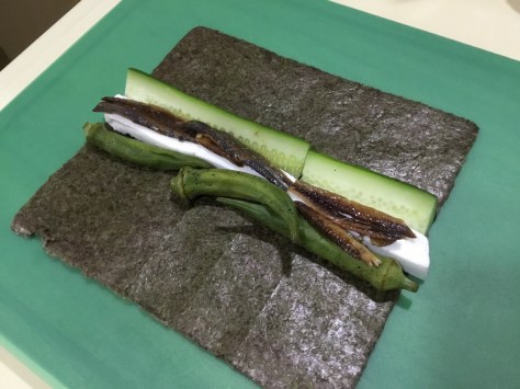 Ensure you wet the end of the nori sheet when finally wrapping it up so that it sticks together easily.