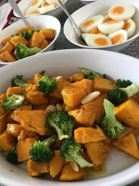 I made some Oven roasted squash and pumpkin with garlic and sautéed broccoli. Also another dish of oven baked tomatoes with cheddar cheese.