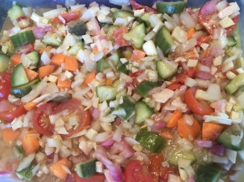Ingredients include onion, garlic, ginger, cucumber, cherry tomatoes, semi-dried tomatoes, carrots, radish, pickled ginger, lemon juice, apple cider vinegar and extra virgin olive oil.
